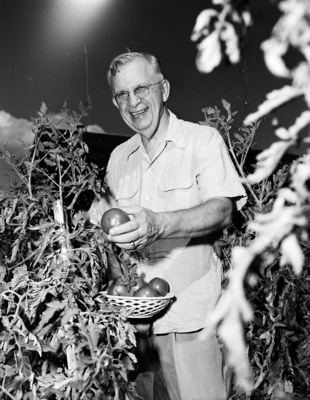 Image of G. R. M. Montgomery Sr., retired Swift & Company manager, shown with a basket of tomatoes. Published in Fort Worth Star-Telegram morning edition July 11, 1951.