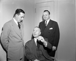 John F. Krey, center, president of the American Meat Institute, demonstrates how thin meat can be cut by AMI research experts. Amazed, at left, is H. Allen of Dallas, North Texas AMI chairman. At right is George M. Lewis of Chicago AMI marking director. Three men wearing suits.