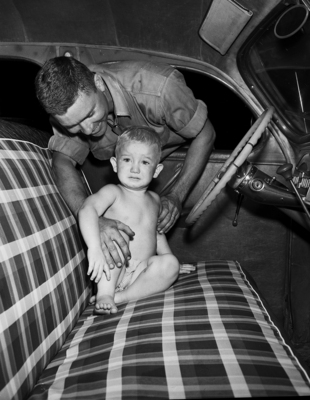 Tears welled up in the eyes of toddler Jimmy Erskine, when the 2-year-old, object of a police hunt, was found by W. D. Martin asleep in Martin's car in the 100 block of S. Henderson. Jimmy's parents, Mr. and Mrs. Kenneth Erskine, 1020 S. Henderson, had been frantically hunting the baby for 2 1/2 hours. Martin, visiting in the neighborhood, lives at 3101 Ramona Drive. Published in Fort Worth Star-Telegram evening edition July 12, 1951.