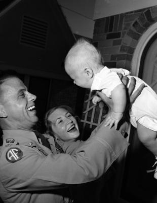 Image of Major Ronald A. Kapp, an army man fresh from the battlefields of Korea, meets his 4-month-old son, Ronald A. Kapp Jr., for the first time. His wife, daughter of Mr. and Mrs. C. T. Subbie of 1712 Frederick, watches the meeting. Published in Fort Worth Star-Telegram evening edition July 12, 1951.