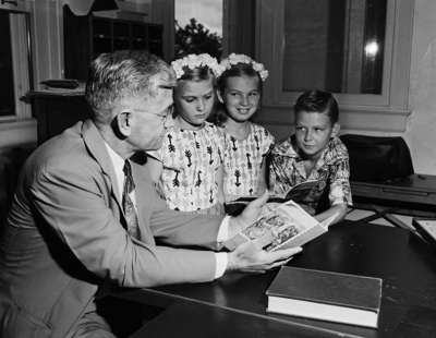 W. Z. Compton, principal at Masonic Home and School, explains the Sunday School lesson to three of the pupils. Left to right, they are: Martha Robinson, 8; Ruby Lee Givens, 8, and John Strong, 10. Published in Fort Worth Star-Telegram evening edition July 14, 1951.
