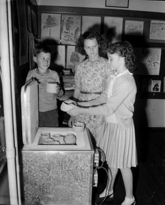 The recently-installed pottery kiln at Diamond Hill School receives a workout by students in the elementary grades, left to right, Paul Smith of 2600 Glendal, Katie Short of 3204 Oscar and Charlean Smith of 3256 Hutchinson putting their pots in the kiln. Published in Fort Worth Star-Telegram morning edition, February 6, 1950.