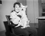 Ralph Hughes, 12, is shown with his best friend, a white Spitz, Queenie. Ralph is hugging his dog Queenie and smiling at the camera. The boy hitchhiked from Wichita Falls to Ennis and back to Fort Worth, to retrieve his beloved pet. Published in Fort Worth Star-Telegram evening edition July 12, 1951.
