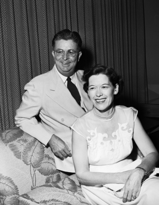 Image of Mr. and Mrs. A. B. Penny, Mr. Penny is an Ad federation governor at an event for a meeting. Published in Fort Worth Star-Telegram morning edition July 13, 1951.