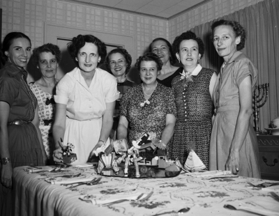 Programs for next year's meetings were planned recently when two committees of the Euterpean Club met at the home of Mrs. LeRoy Black, 4828 Norma. Mrs. M. F. Johnson, right, is chairman of the music study committee. Program committee members are, left to right, Madames Black W. Glenn Darst, W. Robert Hewett, A. E. Soniat, A. Grant Fewsmith, James W. Davis, and Claud D. Helm. Published in Fort Worth Star-Telegram morning edition July 24, 1951.
