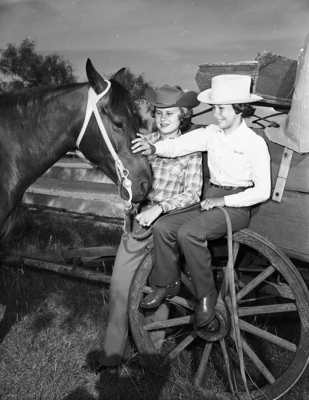 Ready To Ride - Gayle Brewster, left, and Sarah Brewster, both avid horsewomen, make last-minute plans with "Penny" before the kids horse show at the Fort Worth Horseshoe Club Sunday. They are the daughters of Mr. and Mrs. Leo Brewster, 1220 Dorothy Lane.