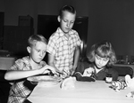 Meet "Perfume", that's what the young students in the Fort Worth Art Association's summer modeling class called Joan Simek's papier mache polecat. Joan, 10, 2918 N. W. 23rd, is shown with two artist-critics, Ronald Dalrymple, 11, 2922 N. W. 23rd, left, and Carrol Lee Richardson 11, 3108 N. W. 26th. The boys are touching up a pink-eyed grey rat. Published in Fort Worth Star-Telegram morning edition July 22, 1951.