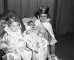 King Earl Kohlman, left, and Queens Judy Ann Daniels, center and Helene Jenkins as they sat over their kingdom at Will Rogers Memorial Coliseum in a contest in which baby royalty was selected by divisions. The supreme king, Carl Webber, was absent but rulers in the tiny tot "A" division were Mike and Mark Dorough with Sherry McMinnamy as queen. Loving cups and medals were given as prizes. Published in Fort Worth Star-Telegram evening July 17, 1951.