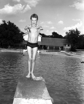 Image shows Peter Finch, 12, on a diving board in front of a body of water. He is competing in city playground swimming meet at Sycamore. Published in the Fort Worth Star-Telegram evening edition, July 19, 1951.