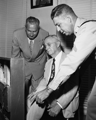 Sargeant P. A. Ziessel of the Texas Department of Public Safety points out the operation of equipment of Public Safety points out the operation of equipment to test brake reactions of drivers. Mayor Edwards, center, is taking the test as Roy Tarwater, president of the Riverside Lions Club looks on. Published in Fort Worth Star-Telegram morning edition July 18, 1951.