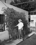 Mr. and Mrs. J. Floyd Thompson, 1622 College, really had some energetic tomato vines this season. Thompson is shown here by some of the hybrid plants, which grew nine feet tall.