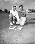 Golfers Ernie Vossler, left, and Harry Phillips, right, are shown kneeling on a golf-course after Vossler fired a record 63 to defeat Phillips in the second round of the City Golf Tournament. Published in the morning edition, July 19, 1951.