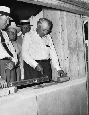 For the Oil & Gas Building under construction at W. 7th and Taylor Streets was laid by Ernest Fender, president of the Acme Brick Company, who has a trowel in hand. Others, left to right, are Blaine C. Swain of Washington, an international district vice president of bricklayers union; R. G. Berry, manager of the Jesse Jones interests in Fort Worth, builders of the new skyscraper.