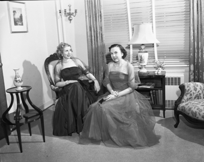 Miss Bita May Hall, left, and Mrs. Mayo Albert, two Texas Christian University (TCU) faculty members, enjoying a respite from hostess duties at the recent faculty tea. Published in Fort Worth Star-Telegram morning edition, February 26,1950.