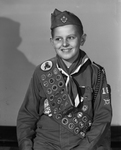 Image of Jimmie Packer, he is in the boy scouts. His uniform consists of a sash with multiple merit badges and the patch on his left pocket is a heart with an eagle in it, indicating that he was at the life rank level. Published in Fort Worth Star-Telegram morning edition July 21, 1951.