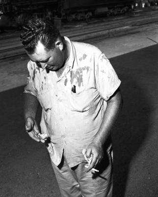 Switch Engine Foreman E. L. Blackerby, who has sweltered in 100-plus degree heat aboard a locomotive, see it's time to knock off. Now he only has to manicure his lawn before the sun goes down. Published in Fort Worth Star-Telegram morning edition July 20, 1951.