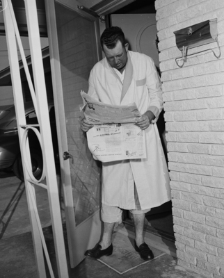 E. L. Blackerby, switch engine foreman for the Santa Fe, start the day fresh and cool. He steps onto the porch of his brick bungalow at 3501 south Lane, picks up his morning paper and faces a discouraging piece of news- more hot weather. Published in Fort Worth Star-Telegram morning edition July 20, 1951.