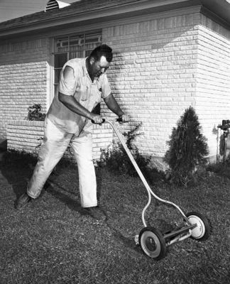 E. L. Blackerby, railroad veteran, shown still absorbing the sun's hot rays as he works on his prized St. Augustine lawn after a hard day's work. Published in Fort Worth Star-Telegram morning edition July 20, 1951.
