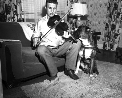 John Robert Morrison, 18, introduces his seeing eye dog, Duke, to his violin, another older friend. the boy has just returned from New Jersey, where he got Duke. Published in Fort Worth Star-Telegram morning edition July 20, 1951.