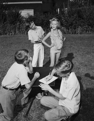 Two neighborhood groups of youngsters turned showmen last week to earn more than $20 for the Star-Telegram Milk and Ice Fund. Pictured is a bathing beauty revue judged by Billy Bonnell, Fred Scott and Dick Cowan, left to right. Contestant is Mary Charlie Murphree. Published in Fort Worth Star-Telegram morning edition July 22, 1951.