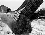 A truckload of silage pours into the trench silo, where it will get a wetting and packing before being covered over for curing.
