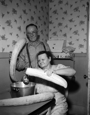 There'll be an ample supply of crisp pickles in the R. E. Scott cupboard this winter. Mr. and Mrs. Scott are shown here preparing just three of the cucumbers from their vines. These three measured more than 100 inches. The Scotts reside at 6463 Hart. Published in Fort Worth Star-Telegram morning edition August 12, 1951.