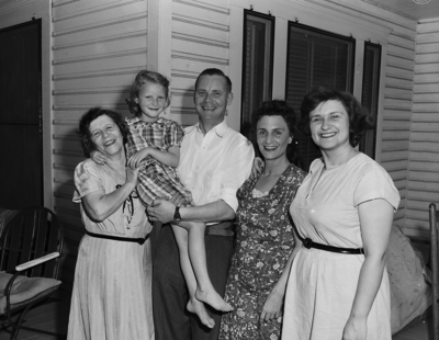 This Latvian family sponsored by two Arlington sisters, Misses Grace and Myrtle Thornton were reunited in Arlington after arrival of Mr. and Mrs. Charles Dakteris and their daughter, Iness, from a DP (displaced persons) camp in Germany. Left to right, they are Mrs. Sophie Francis, mother of Mrs. Dakteris, Iness, Dakteris, Mrs. Dakteris and Miss Sonja Francis of Dallas. Mrs. Francis and daughter, Sonja, also are DPs who arrived in Arlington last September. Published in Fort Worth Star-Telegram morning edition July 22, 1951.