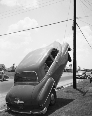 Mrs. Marion B Lougee, 3833 Heywood, turned in the driver's seat to clos an open car door. The car went out of control over a curb in the 3600 block of Trail Lake Dr. and rode up a steel guy wire, coming to rest balanced on the rear bumper with all four wheels spinning. Damage: Two scratched bumpers. Published in Fort Worth Star-Telegram morning edition July 21, 1951.