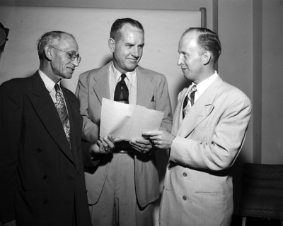Making plans for a meeting of the newly-organized Silver Creek Civic League are, left to right, Reverend Otis Irby, secretary, Parker County member; Louis Snipes, vice president, and Reverend Arthur M. Brewer, League is seeking better road from Jacksboro Highway to Weatherford in northwest Tarrant and eastern Parker Counties. Published in Fort Worth Star-Telegram evening edition July 25, 1951.