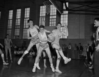 Image shows W.C. Striplings Vance Bridges (15) attempts to take the ball away from Meadowbrook's Richard O'Neal (14) as Don Sifford (20) looks on. Stripling won opening game in junior high school playoff, 23-18. From left to right, unidentified (3), Don Sifford (20), Vance Bridges (15), Richard O'Neal (14), unidentified referee.