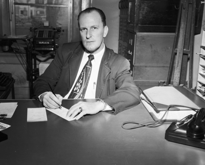 Image of Frankie Berryman, Runnels County Clerk. He was one of several Runnels county citizens to comment on recent oil activity. He is shown sitting inside an office behind a desk, looking toward the camera. Published in the morning edition, February 26, 1950.