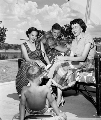 "And I Swam So Far", said Freddee Berry to Mrs. George S. Moore, left, Gary Moore, and Mrs. W. H. Adams. Published in Fort Worth Star-Telegram morning edition, August 5, 1951.