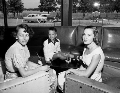 A Pause In the Lounge helped Mrs. Don F. Perkin, left, and Mrs. E. G. Berry and son, Freddee, keep cool. Published in Fort Worth Star-Telegram morning edition, August 5, 1951.