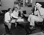 Attorneys Abe Herman, left, of Fort Worth and Tom McMurry, second from left, of Decatur, study minutes of the Boyd School Board after farmers charged the tax equalization board was not legally appointed by the school board. At right is A. L. Tinney, owner of 215 acres of land valued at $2,580 under the old valuation plan and raised to $9,000 under the new proposal. Published in Fort Worth Star-Telegram evening edition July 25, 1951.