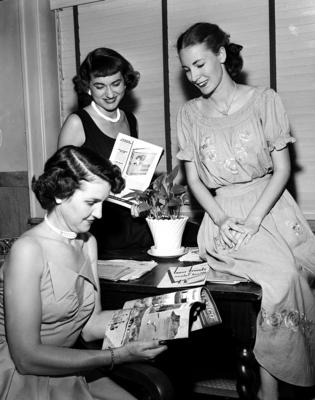 Miss Mary Louise Anderson, right, director of the YWCA Commuters Camp, checks camping ideas with Mrs. Connie Pickens, left, and Miss Donna Smith. Mrs. Pickens is chairman of the camp committee and Miss Smith a committee member. Published in Fort Worth Star-Telegram evening edition July 26, 1951.