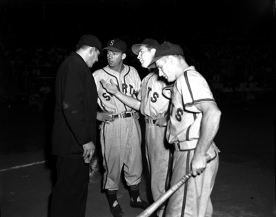 Frances (Salty) Parker, second from left and two unidentified players and umpire (not published).