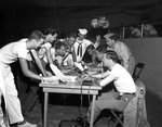 Glider Model Fliers - Signing up for glider model competition Thursday at Will Rogers Memorial Coliseum, left to right, James Carpenter, Lubbock; Paul Simon, Detroit; Dick Everett, San Diego, and Bob Brawner, Phoenix, Arizona with J. T. Elliott, aviation metalsmith 2nd class, holding retriever balloons, and other officials, Jim Clem, Dallas; Lieutenant Commander M. R. Ball, Fort Worth; Ernest Donohoo, Dallas, and Richard Mossoney, Detroit, helping the contestants.