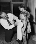 Something For The Kids - Reverend George Williams, fits a dress to Ruby Catherine Hunt, 4, as her big sister, Mary Jane, 7, watches critically.