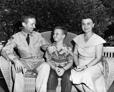 Family Reunited - Nine-year-old David Dews grins proudly at his father, Lieutenant Colonel Omer S. Dews, who was returned to the United States for reassignment after serving 10 months in Korea. At right is Mrs. Dews.