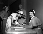 Miss Carolyn Tandler of Larchmont, N. Y. at guest book. Amon Carter visible in the background.