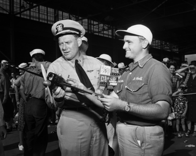 It's Sure Pretty - Commander Arthur Godfrey, better known as a radio and television star, admires a winning plane owned by Bob Lutker, right of 3105 Cockrell, Fort Worth, at the National Model Airplane Championship meet at Grand Prairie Sunday. Lutker's craft won first place in the team flying event.
