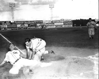Boris (Babe) Martin, San Antonio catcher, tags out the Cats' Frank Brown in the first inning of game at La Grave Field. Frank's attempt to score from third base came after Jack Banta had grounded to the Missions' George Hausmann at ground the Cats won despite this setback, 6-1. Published in Fort Worth Star-Telegram morning edition, July 30, 1951.