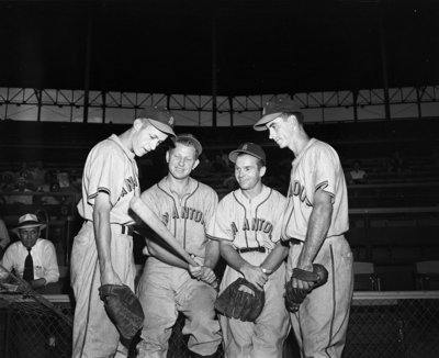 San Antonio Third Baseman Mickey Rutner, a 300 hitter, gives his infield mates a few tips. Left to right, First Baseman Jack O'Donnell, Rutner, Second Baseman George Hausmann and Shortstop Billy DeMars. Published in Fort Worth Star-Telegram evening edition, July 31, 1951.