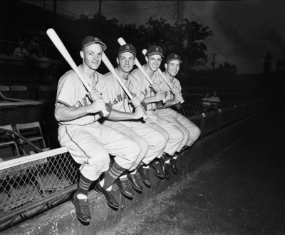 Austin Knickerbocker, James Dyck, Roy Sievers and Omer Tolson of the San Antonio Missions whom the Fort Worth Cats are playing in San Antonio. Sievers is out of action because of injury. The others took part in game. Dyck made two hits, but the Cats won, 9-4, in 10 innings. Published in Fort Worth Star-Telegram evening edition, August 15, 1951.