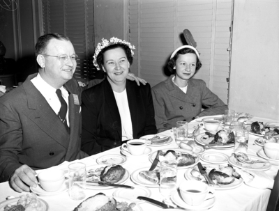 Attitude of the people is right, said Jesse James of Austin, state treasurer, who was pictured at the bankers' luncheon with Mrs. James and their daughter, Miss Doris James. The treasurer agrees that the business outlook for Texas is bright. Published in Fort Worth Star-Telegram morning February 23, 1950.