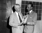 For Model Traffic Law - Mayor J. R. Edwards, left, is shown receiving Wednesday from Larry Graff, safety director of the Fort Worth Safety Council, a plaque citing Fort Worth for conforming it's traffic ordinances to model national regulations.