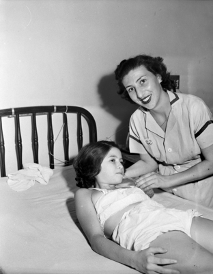 Polio Worker - Mrs. Sylvia Schweiger, left, doesn't have much trouble doing her work in City-County Hospital Polio Ward despite a language difficulty, as shown here when she gives Clara Janis Sneed a drink of water.