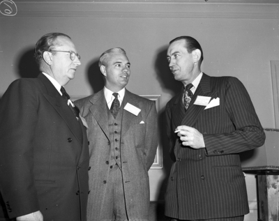 The Scurry County oil discovery came in for lots of talk among these bankers, left to right, Gus Holstrom, vice president of the First National Bank of Fort Worth; William M. Fuller, president of the Snyder National Bank, and B. T. Cardwell, vice president of the First State Bank of Odessa. Published in Fort Worth Star-Telegram morning edition February 23, 1950.