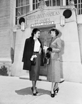 For the big game, TCU- Alice Langford, left, in a dark gray flannel peg-top skirt, white cotton blouse and charcoal gray flannel topper trimmed with red velveteen collar and cuffs. June Prichard in classic brown tweed suit. Published in Fort Worth Star-Telegram morning August 12, 1951.