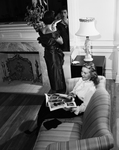 Last minute beauty check- Two TCU, Alice Langford , at mirror, wears a swish draped date dress in iridescent blue taffeta. Joy teams a frilly white crepe blouse with gathered velveteen skirt. Published in Fort Worth Star-Telegram morning August 12, 1951.